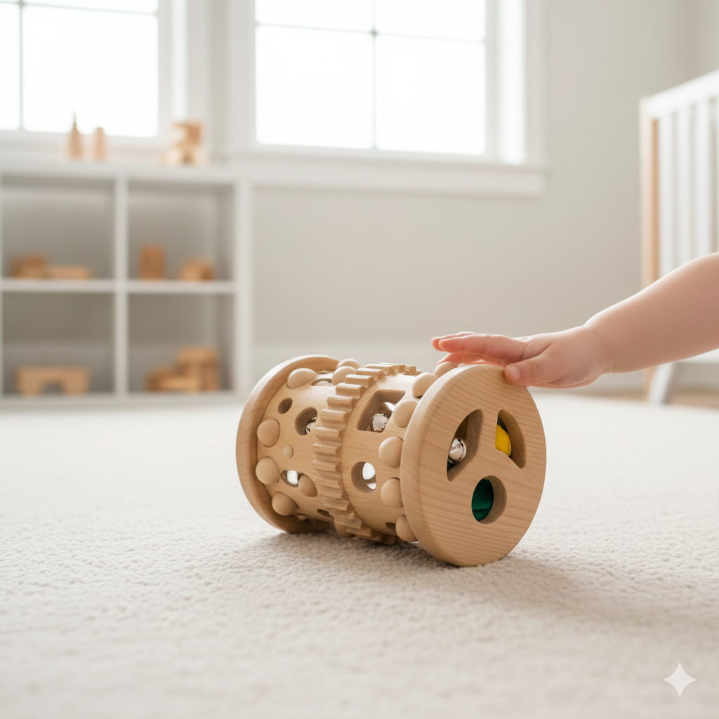 Función Clave: Cruza la línea media. Obliga al bebé a coordinar ambas manos para pasar el objeto o hacerlo sonar, estimulando ambos hemisferios cerebrales.