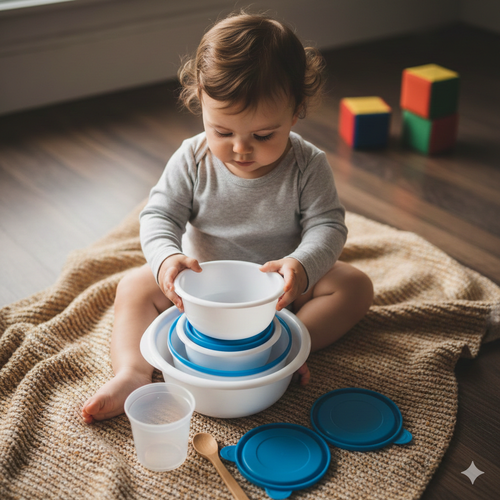 - Tamaño y Volumen: El acto de encajar cuencos (uno dentro del otro) enseña al niño las nociones de volumen y espacio.