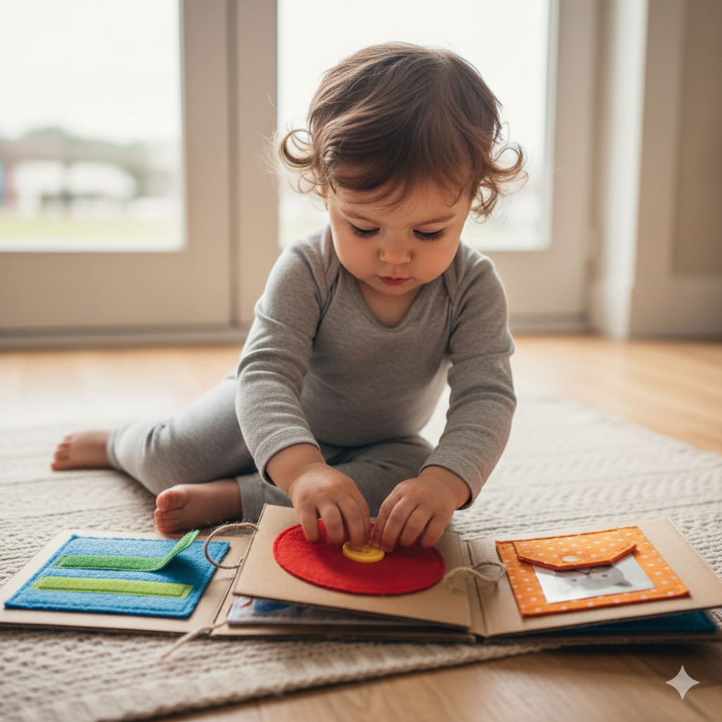 Alternativa casera: Trozos de tela con botones grandes, velcros o solapas pegadas a cartón. Se pueden crear actividades sensoriales y manuales en casa, igual que un libro Montessori.