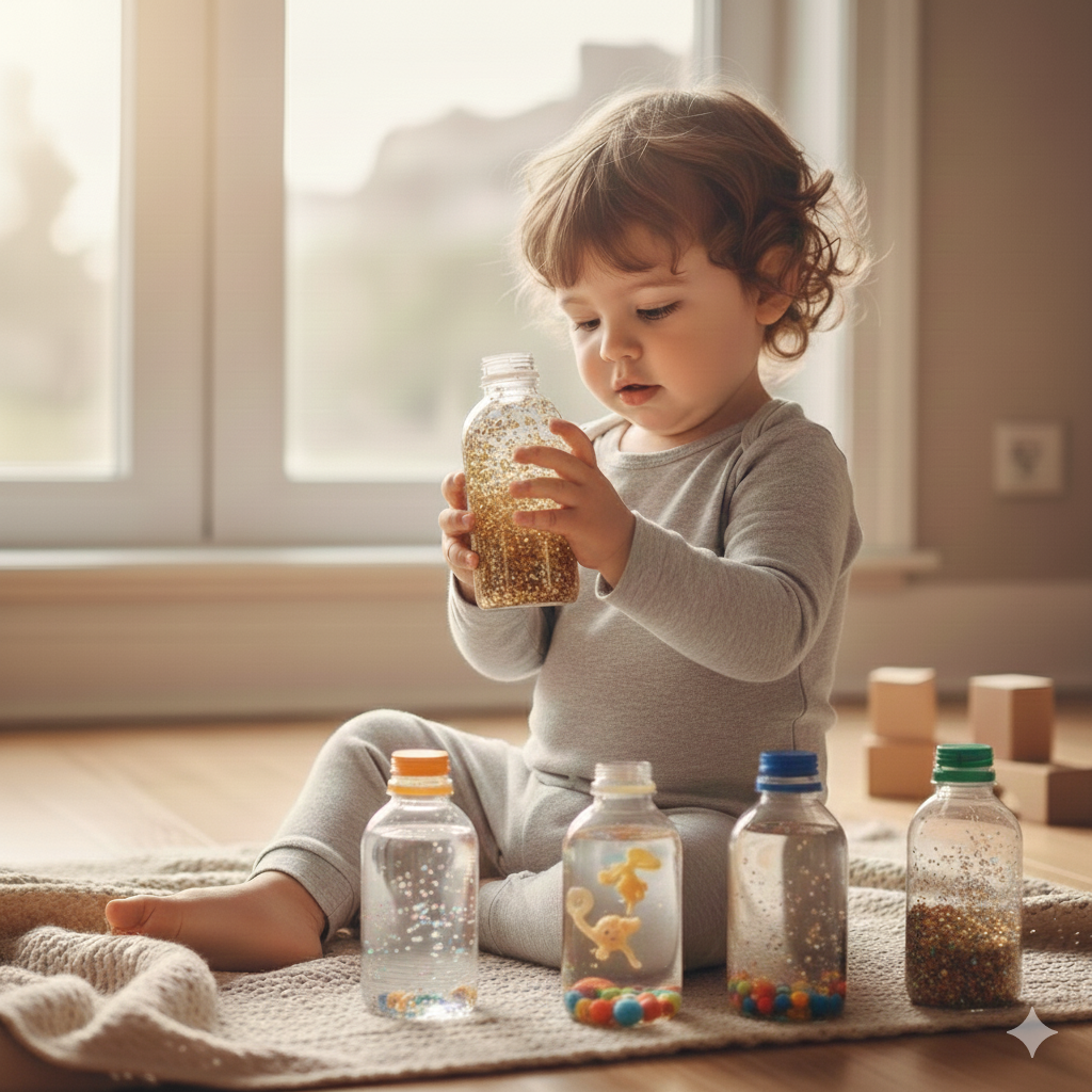 Llenar botellas transparentes con arroz, lentejas o purpurina crea un Bote de Calma que estimula múltiples sentidos. Fomentan la exploración a través de la vista (observando el movimiento del contenido) y la audición (agitando para escuchar sonidos). El bebé desarrolla la motricidad fina al sujetar y rotar la botella, y entrena la concentración y la regulación emocional.