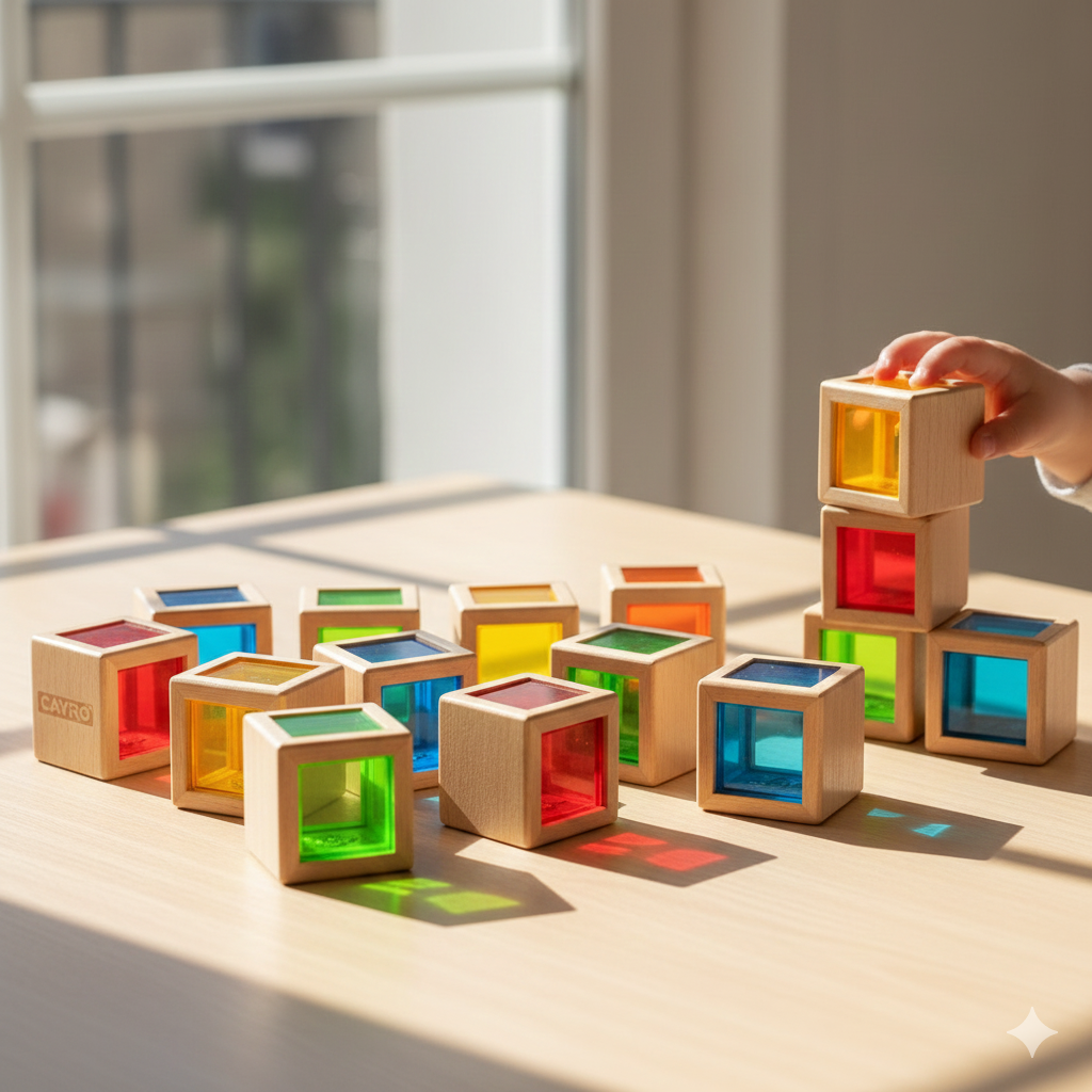 Este juego de bloques translúcidos con marco de madera es ideal para el desarrollo multisensorial, estimulando la vista con sus colores vivos que interactúan con la luz, y el tacto gracias a la combinación de materiales.